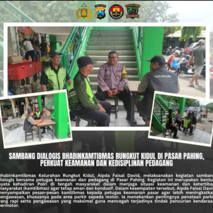SURABAYA, 28 FEBRUARI 2026 – Bhabinkamtibmas Kelurahan Rungkut Kidul, Aipda Faisal David, melaksanakan kegiatan sambang dialogis bersama petugas keamanan pasar dan seluruh pedagang di Pasar Pahing. Kegiatan yang menjadi bentuk nyata kehadiran Kepolisian Negara Republik Indonesia (Polri) di tengah masyarakat ini bertujuan untuk menjaga situasi keamanan dan ketertiban masyarakat (kamtibmas) agar tetap dalam kondisi aman, …