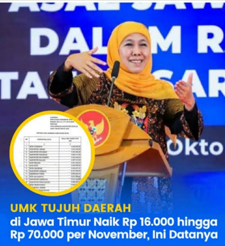 Besaran Upah Minimum Kabupaten atau Kota (UMK) terbaru untuk tujuh kabupaten/kota di Jatim. Telah ditetapkan oleh Pemerintah Provinsi Jawa Timur (Pemprov Jatim).