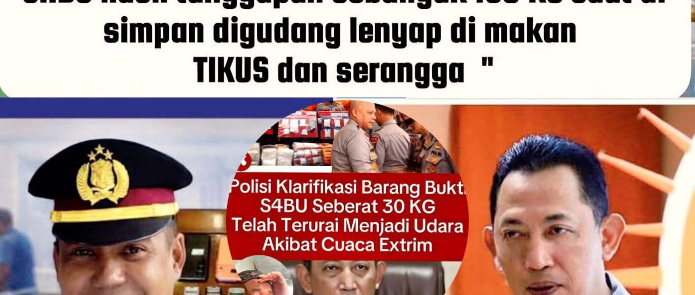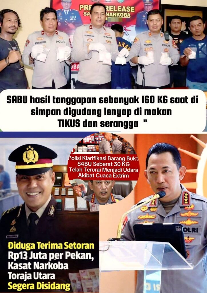 TORAJA, SULAWESI SELATAN – 28 FEBRUARI 2026 – Kasus yang mencengangkan muncul dari wilayah Kapolres Toraja, Sulawesi Selatan, setelah barang bukti sabu seberat 160 kilogram yang sebelumnya berhasil diamankan oleh pihak kepolisian dan disimpan di gudang narkotika resmi ternyata tidak dapat ditemukan. Menurut kesaksian dari petugas yang menangani penyimpanan barang bukti tersebut, jumlah sabu yang besar itu diklaim telah hilang karena habis dimakan tikus dan serangga yang menginfestasi area gudang penyimpanan.
