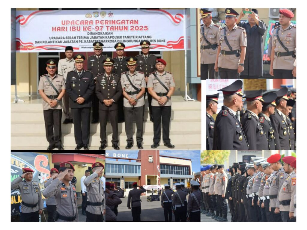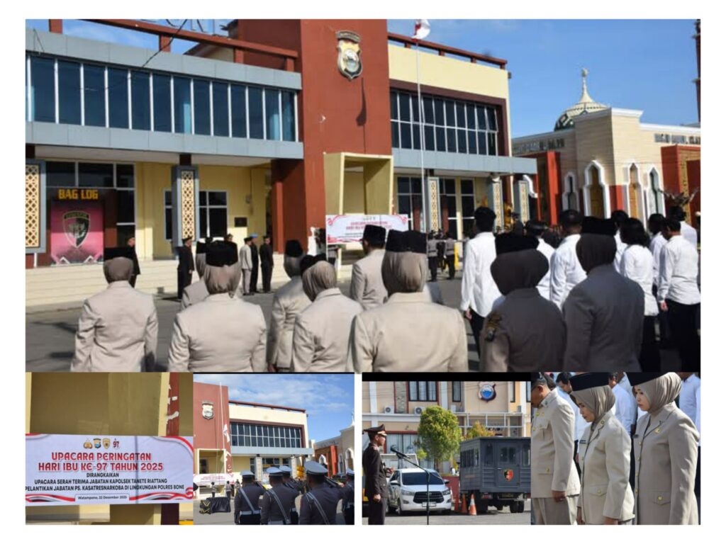Watampone – Polres Bone Polda Sulawesi Selatan menggelar rangkaian kegiatan penting di Aula Sarja Arya Racana Mapolres Bone, Senin (22/12/2025): Upacara Peringatan Hari Ibu ke-97 Tahun 2025 yang dirangkaikan dengan Serah Terima Jabatan (Sertijab) Kapolsek Tanete Riattang dan Pelantikan Kasatresnarkoba Polres Bone. Upacara dipimpin langsung oleh Kapolres Bone AKBP Sugeng Setio Budhi, S.I.K., M.Tr.Opsla selaku Inspektur Upacara, dengan hadirnya Wakapolres Bone Kompol Antonius Tutleta, S.Pd., para Pejabat Utama Polres Bone, para Kapolsek jajaran, perwira, bintara, dan ASN Polres Bone.
