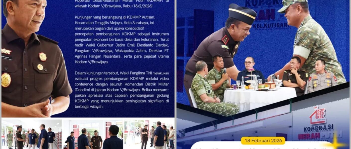 Kunjungan yang berlangsung pada Rabu (18/2/2026) ini difokuskan di KDKMP Kutisari, Kecamatan Tenggilis Mejoyo, Kota Surabaya. Acara ini merupakan bagian krusial dari upaya konsolidatif pemerintah dan TNI dalam mendorong percepatan pembangunan KDKMP sebagai instrumen vital penguatan ekonomi yang berbasis pada potensi desa dan kelurahan. Kehadiran sejumlah pejabat penting turut menandai keseriusan agenda ini, antara lain Wakil Gubernur Jatim Emil Elestianto Dardak, Pangdam V/Brawijaya, Wakapolda Jatim, Direktur PT Agrinas Pangan Nusantara, serta para pejabat utama Kodam V/Brawijaya.
