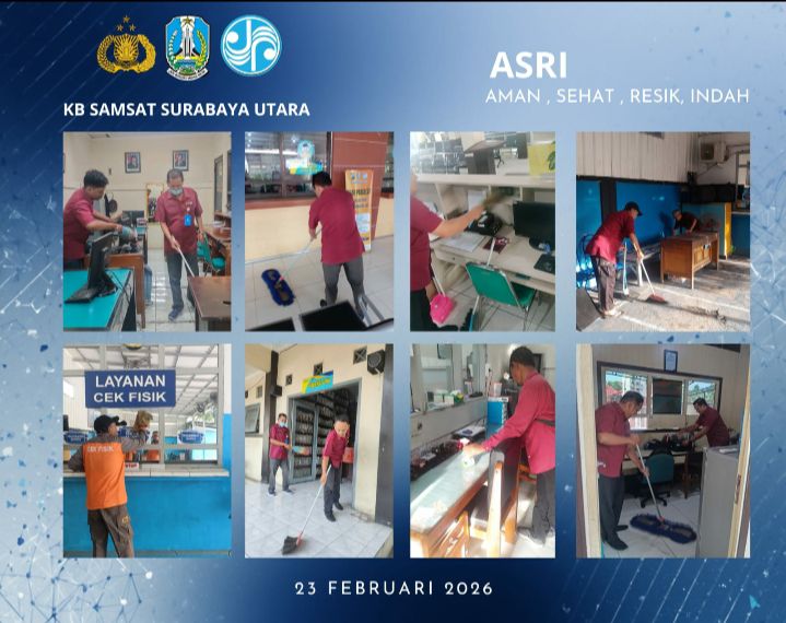 Surabaya, 23 Februari 2026 – Kantor Pelayanan Samsat (KB) Surabaya Utara menggelar kegiatan kebersihan bersama secara menyeluruh pada hari ini, Senin (23/2). Kegiatan yang mengusung tema “ASRI – Aman, Sehat, Resik, Indah” bertujuan untuk menciptakan lingkungan kerja dan ruang pelayanan yang nyaman, higienis, serta mendukung pelayanan publik yang lebih prima bagi masyarakat.