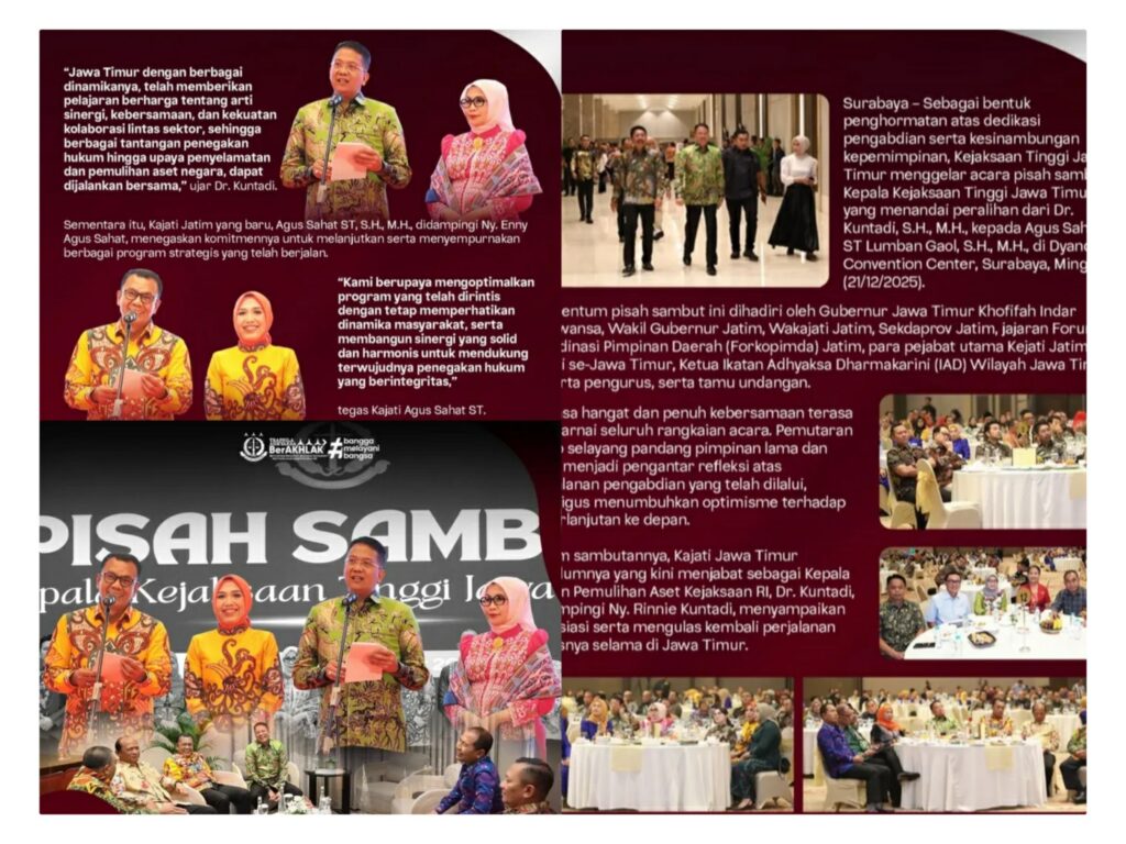 Surabaya – Kejaksaan Tinggi Jawa Timur (Kejati Jatim) menggelar acara pisah sambut yang khidmat dan penuh kehangatan di Dyandra Convention Center, Surabaya, Minggu (21/12/2025), menandai transisi kepemimpinan dari Dr. Kuntadi, S.H., M.H., kepada Agus Sahat ST Lumban Gaol, S.H., M.H. Momentum ini bukan hanya sekadar perpisahan dan penyambutan, tetapi juga penegasan komitmen untuk terus memperkuat soliditas internal dan melanjutkan kinerja Kejati Jatim dalam menegakkan hukum yang berkeadilan.