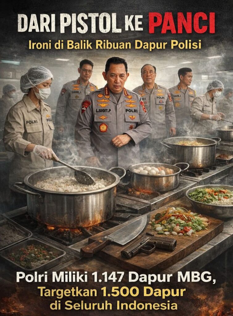 Angka itu terpampang jelas dan tak main-main: 1.147 DAPUR. Bukan satu atau dua kantin kejujuran, melainkan lebih dari seribu unit dapur Makan Bergizi Gratis (MBG) yang kini berada di bawah kendali Polri. Bahkan, targetnya akan digenjot hingga 1.500 unit ke depannya. Ini adalah operasi logistik raksasa yang melibatkan perencanaan, sumber daya manusia, dan anggaran yang tidak sedikit—ironisnya, dijalankan oleh institusi yang seharusnya sibuk membedah berkas perkara, bukan menu makan siang.