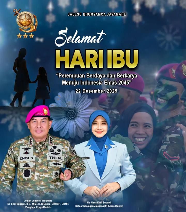 Pada hari Senin, 22 Desember 2025, dalam rangka memperingati Hari Ibu Nasional, Panglima Korps Marinir Letnan Jenderal TNI (Mar) Dr. Endi Supardi, S.E., M.M., M.Tr.Opsla., CHRMP., CRMP., bersama dengan Ketua Gabungan Jalasenastri Korps Marinir Ny. Nana Endi Supardi, menyampaikan ucapan hangat sekaligus menyoroti peran sentral perempuan dalam mewujudkan visi Indonesia Emas 2045 melalui tema “Perempuan Berdaya dan Berkarya Menuju Indonesia Emas 2045”.