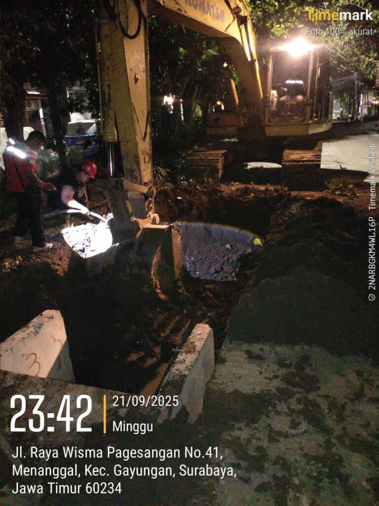 Surabaya.ONEPOST.WEB.ID Proyek pembangunan saluran drainase di Jl. Raya Wisma Pagesangan No.41, Kelurahan Menanggal, Kecamatan Gayungan, Surabaya menuai kritik tajam dari warga dan pemerhati keselamatan. Pantauan lapangan pada Minggu (21/09/2025) malam menunjukkan pekerjaan galian boks culvert beton yang belum selesai, dengan pengamanan dan manajemen keselamatan (K3) dinilai kurang memadai.