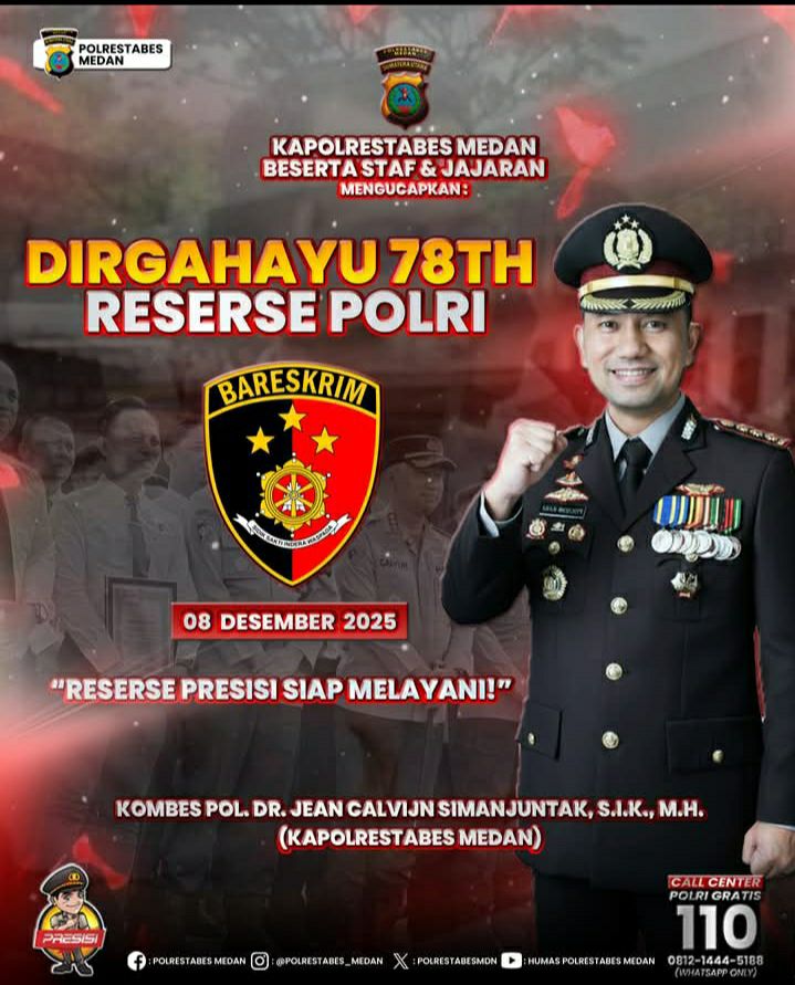 Medan, 8 Desember 2025 – Di bawah kepemimpinan Kapolrestabes Medan, Kombes Pol. Dr. Jean Calvijn Simanjuntak, S.I.K., M.H., Reserse Polrestabes Medan memasuki era baru penegakan hukum yang mengintegrasikan teknologi canggih dan pendekatan humanis. Perayaan Hari Ulang Tahun (HUT) ke-78 Reserse Polri menjadi momentum untuk menegaskan komitmen dalam mewujudkan penegakan hukum yang lebih efektif, efisien, dan berkeadilan.