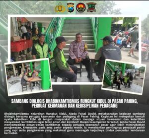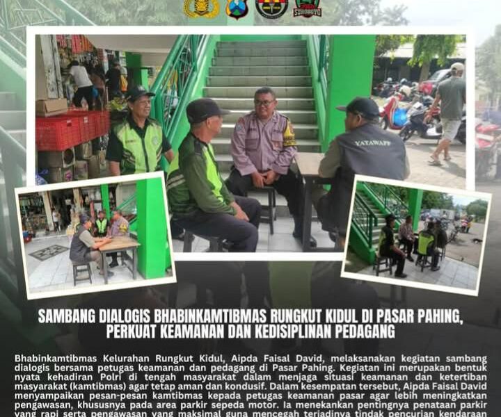 SURABAYA, 28 FEBRUARI 2026 – Bhabinkamtibmas Kelurahan Rungkut Kidul, Aipda Faisal David, melaksanakan kegiatan sambang dialogis bersama petugas keamanan pasar dan seluruh pedagang di Pasar Pahing. Kegiatan yang menjadi bentuk nyata kehadiran Kepolisian Negara Republik Indonesia (Polri) di tengah masyarakat ini bertujuan untuk menjaga situasi keamanan dan ketertiban masyarakat (kamtibmas) agar tetap dalam kondisi aman, kondusif, dan mendukung aktivitas perekonomian lokal.