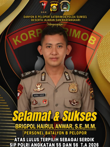 SELAMAT DAN SUKSES! BRIGPOL HAIRUL ANWAR, S.E., M.M. DARI SATBRIMOB POLDA SUMSEL LULUS TERPILIH SEBAGAI SERDIK SIP POLRI ANGKATAN 55 DAN 56 T.A 2026 – KOMANDAN BATALYON B PELOPOR BERSAMA JAJARAN DAN BHAYANGKARI BERDOA SEMOGA DILIPUTI KEBERKAHAN DALAM PENGAWASAN