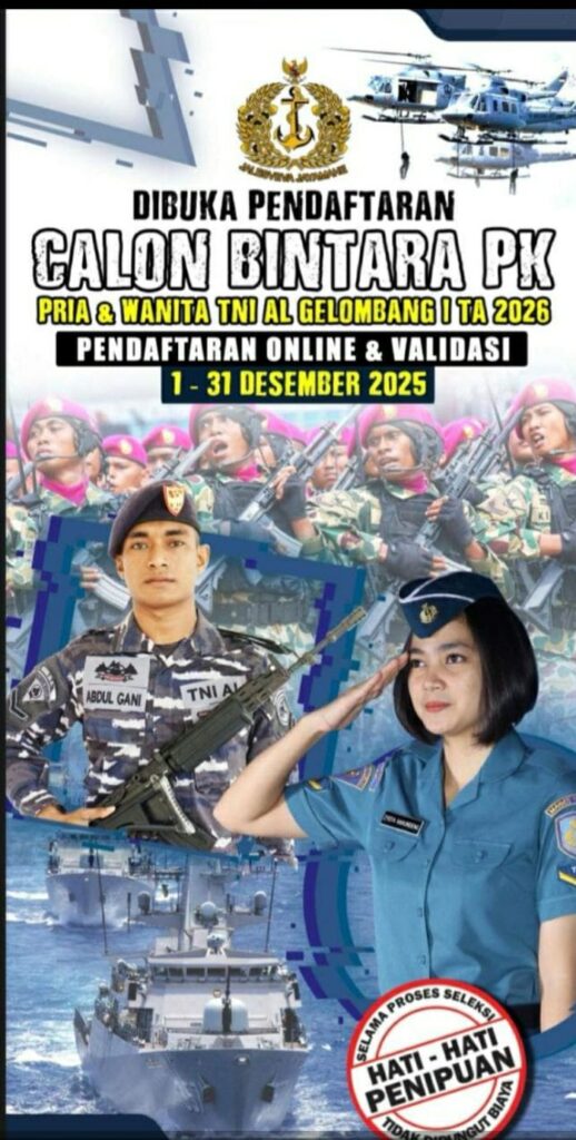 [Kota], 23 November 2025 – Kesempatan emas bagi generasi muda Indonesia yang berjiwa bahari! TNI Angkatan Laut (TNI AL) dengan bangga mengumumkan dibukanya pendaftaran Calon Bintara Prajurit Karier (PK) Gelombang I Tahun Anggaran 2026. Ini adalah panggilan untuk mengabdikan diri, menjaga kedaulatan laut Nusantara, dan menjadi bagian dari keluarga besar TNI AL.