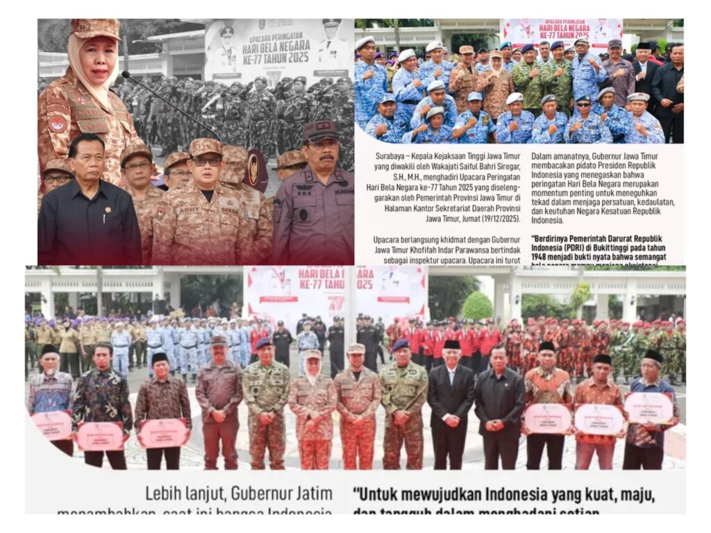 Surabaya – Kepala Kejaksaan Tinggi (Kejati) Jawa Timur yang diwakili oleh Wakil Kepala Kejati (Wakajati) Saiful Bahri Siregar, S.H., M.H., menghadiri Upacara Peringatan Hari Bela Negara ke-77 Tahun 2025 yang diselenggarakan oleh Pemerintah Provinsi Jawa Timur di Halaman Kantor Sekretariat Daerah Provinsi Jawa Timur, Jumat (19/12/2025). Upacara yang diadakan secara resmi dan khidmat menjadi momentum untuk menegaskan tekad seluruh elemen bangsa dalam menjaga persatuan, kedaulatan, dan keutuhan Negara Kesatuan Republik Indonesia (NKRI).